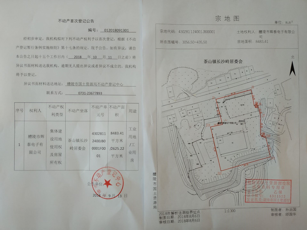 不动产首次登记公告(醴陵市辉泰电子有限公司)