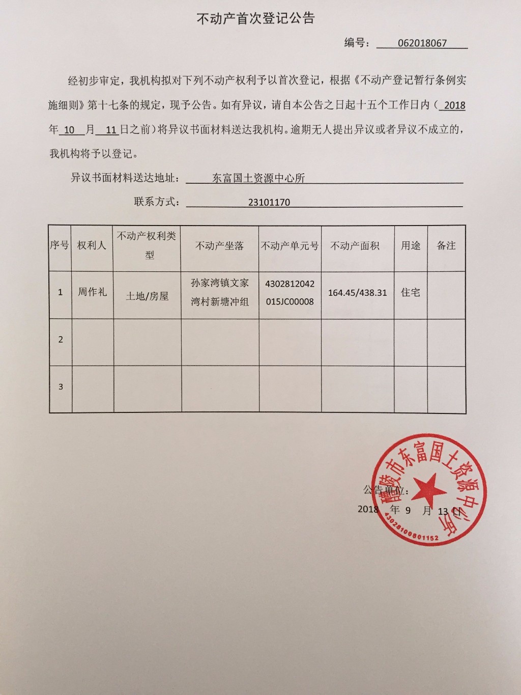 不动产首次登记公告(周作礼)