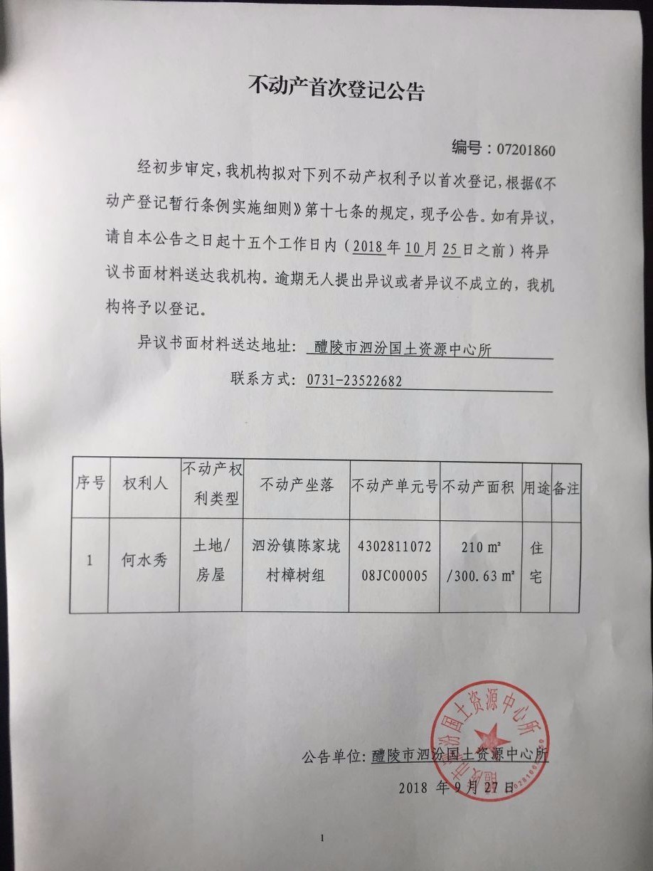 不动产首次登记公告(何水秀)