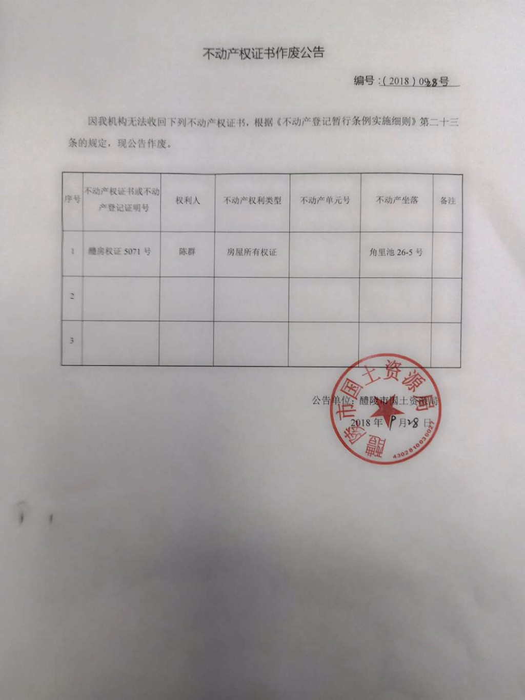 不动产权证书作废公告(陈群)
