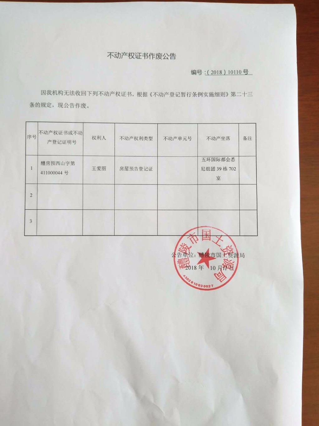 不动产权证书作废公告(王爱丽)