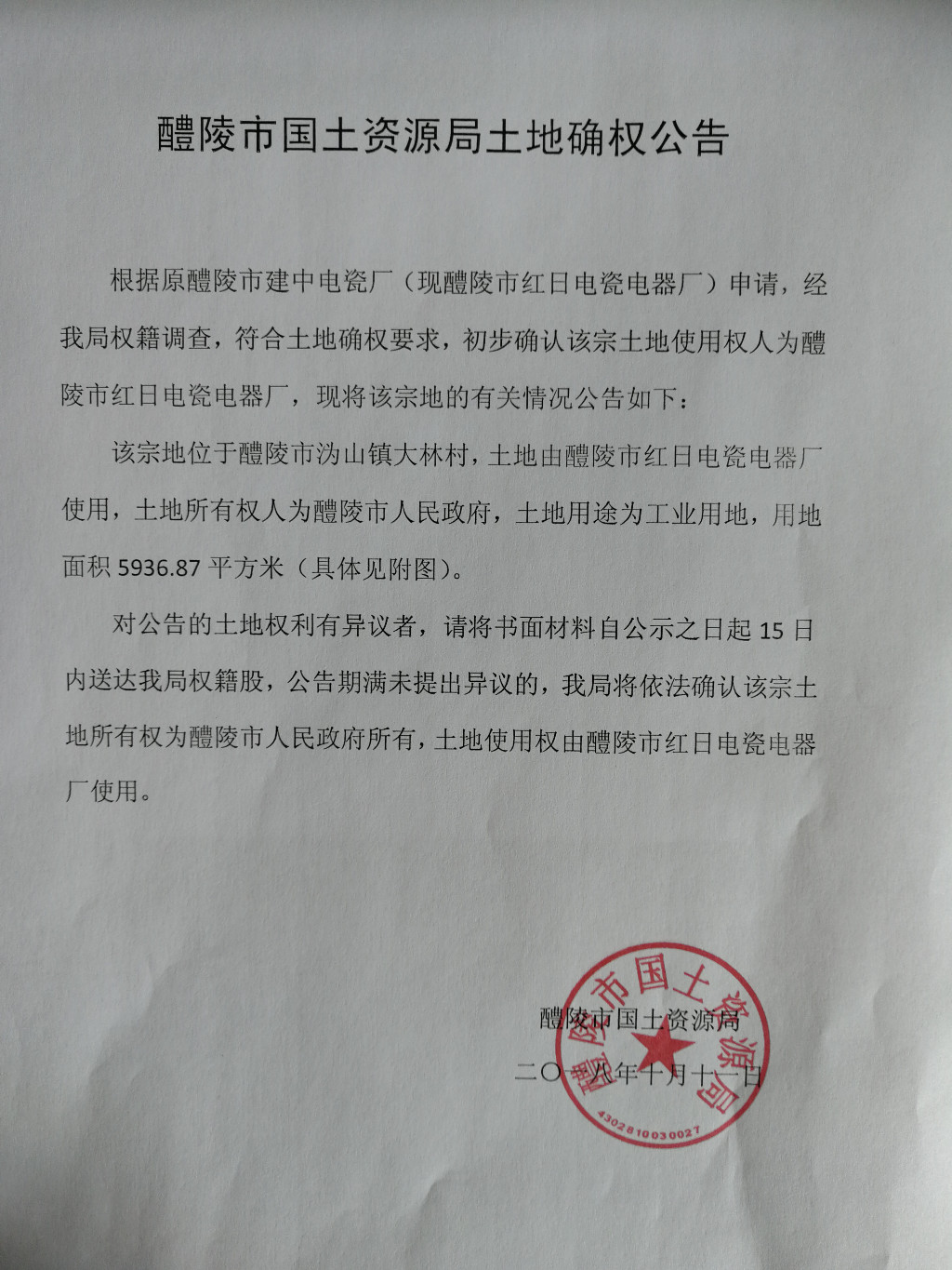醴陵市国土资源局土地确权公告(醴陵市红日电瓷电器厂)