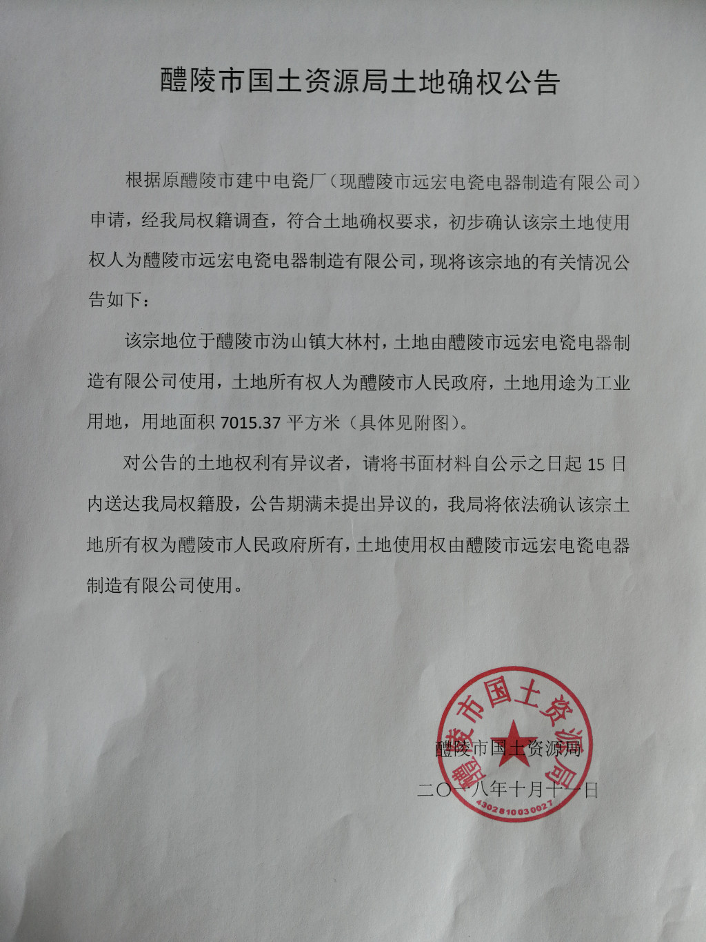 醴陵市国土资源局土地确权公告(醴陵市远宏电瓷电器制造有限公司)