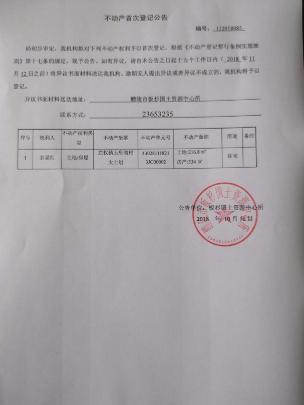 不动产首次登记公告(余显红)