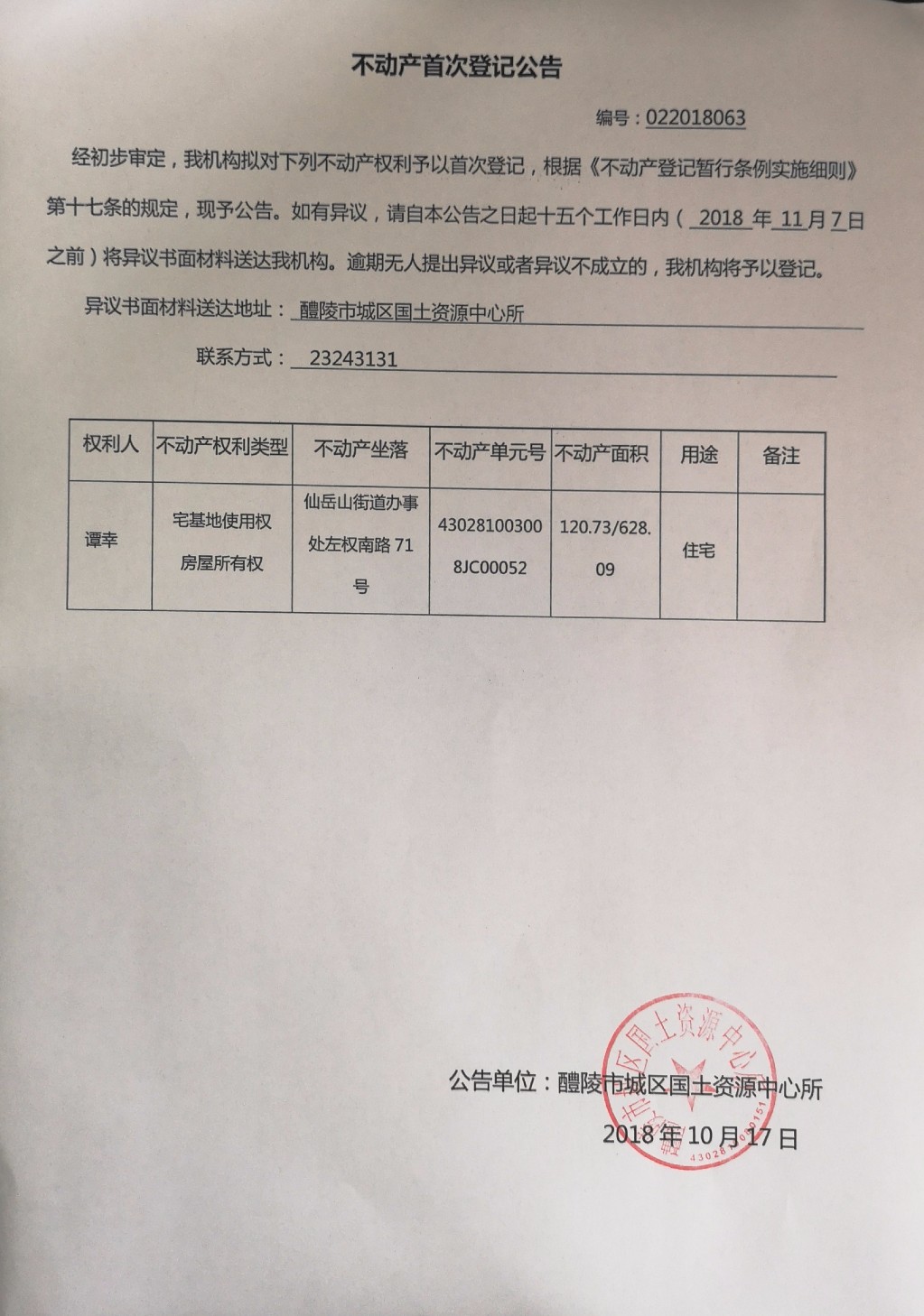 不动产首次登记公告(谭幸)