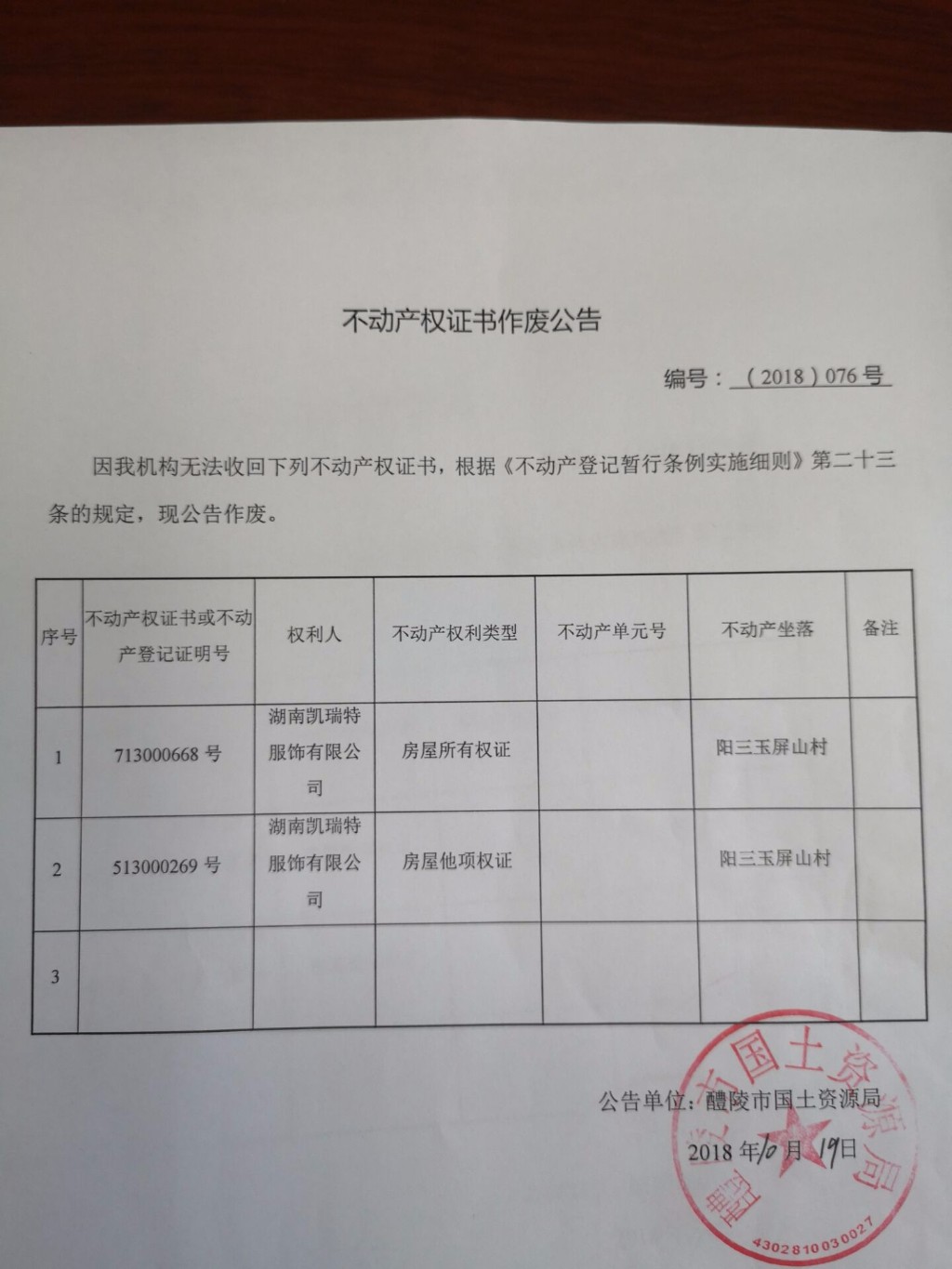 不动产权证书作废公告(湖南凯瑞特服饰有限公司)