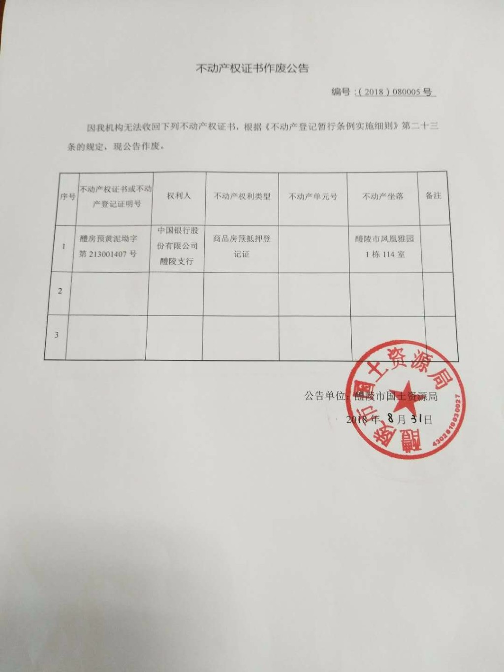不动产权证书作废公告(中国银行股份有限公司醴陵支行)