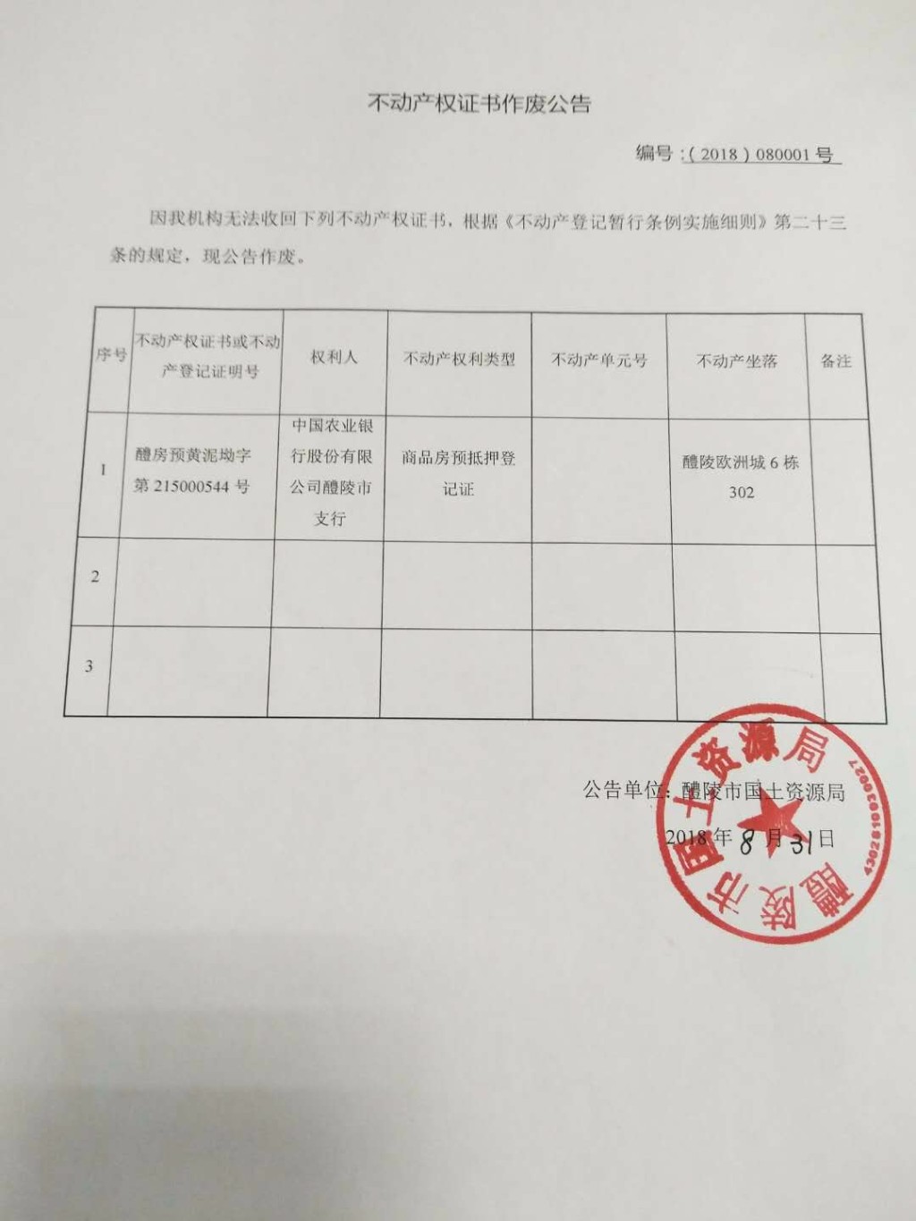 不动产权证书作废公告(中国农业银行股份有限公司醴陵市支行)
