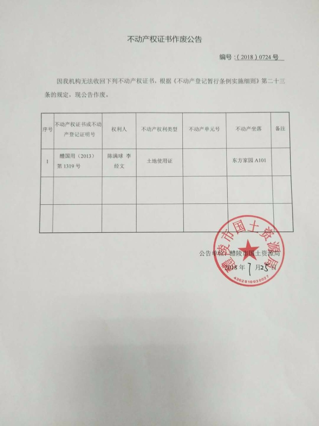 不动产权证书作废公告(陈满球、李经文)