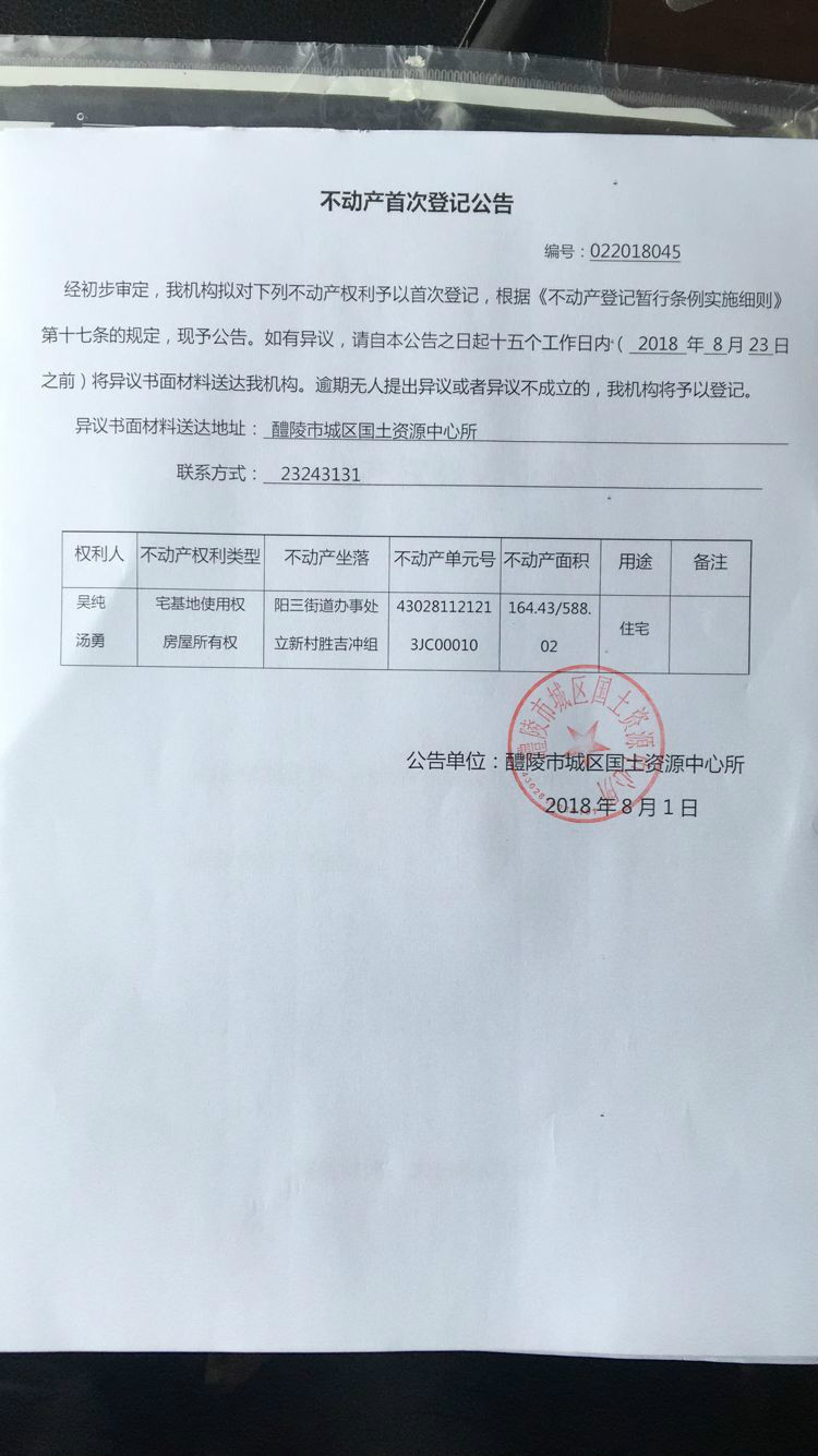 不动产首次登记公告(吴纯 汤勇)