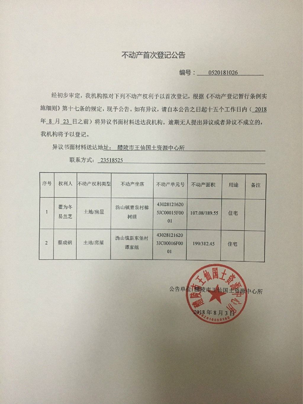 不动产首次登记公告(瞿为冬 易兰芝、蔡成钢)