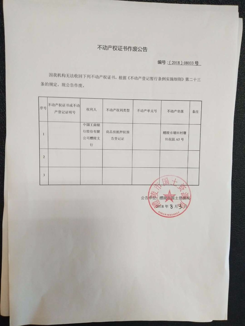 不动产权证书作废公告(中国工商银行股份有限公司醴陵支行)