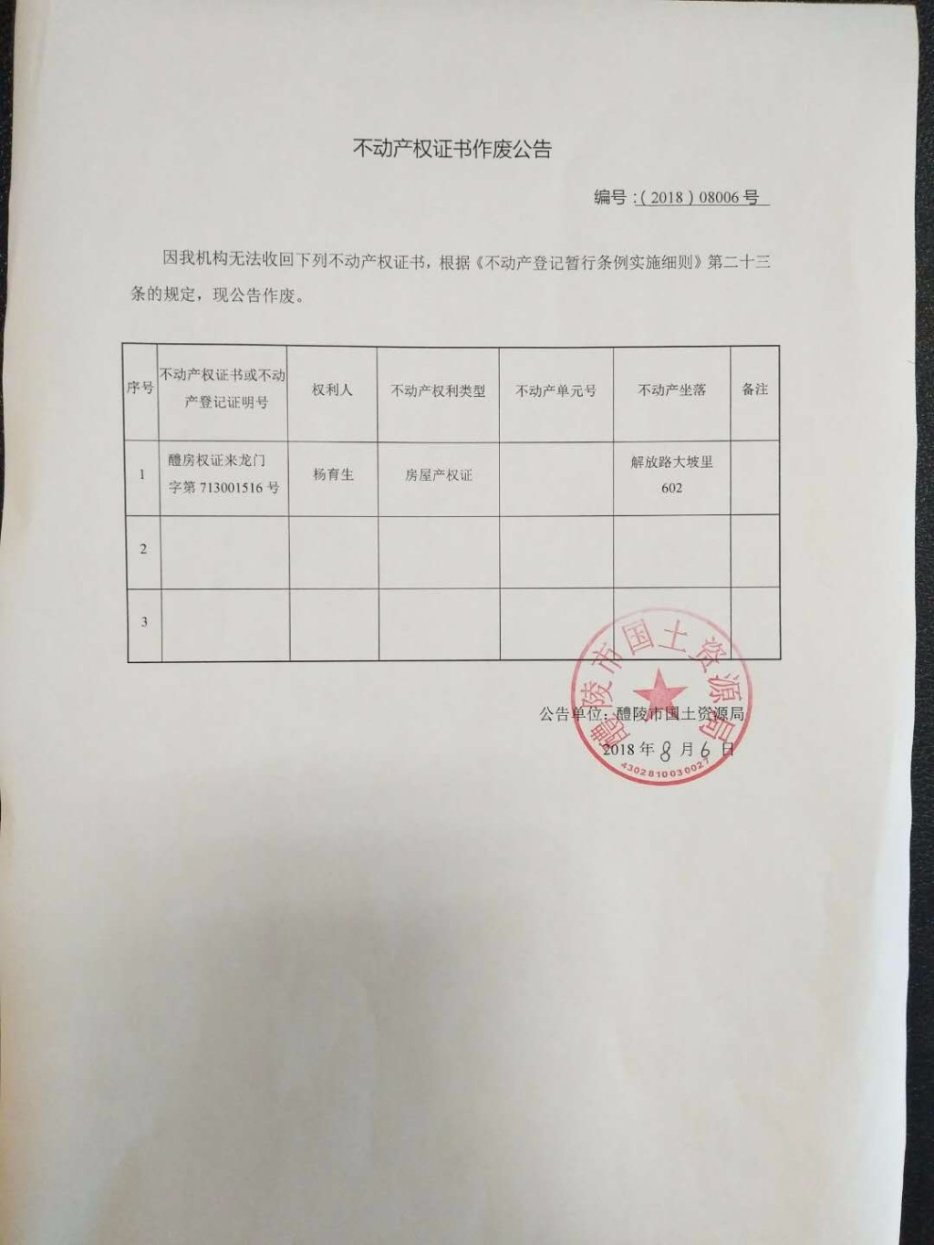 不动产权证书作废公告(杨育生)