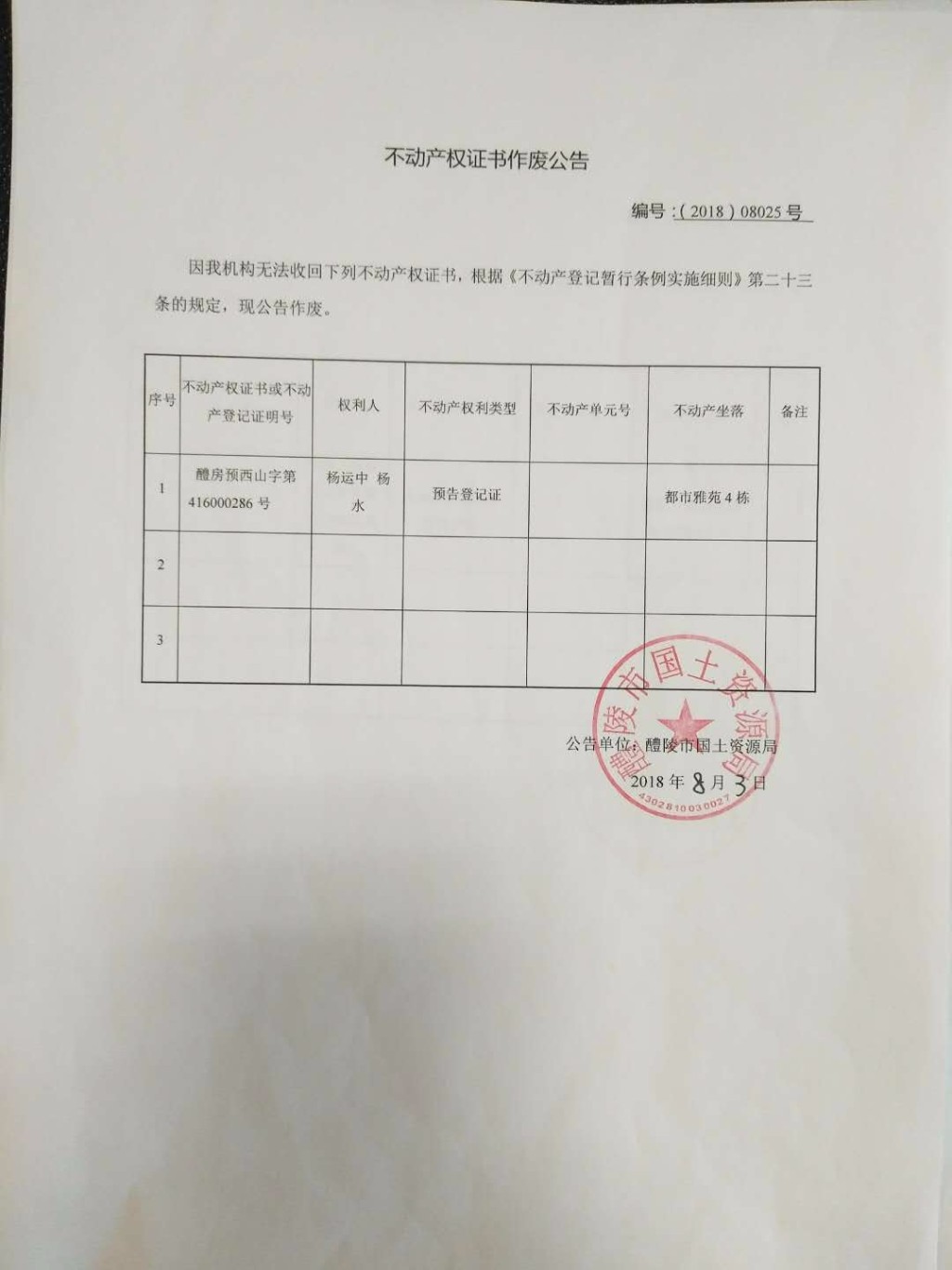 不动产权证书作废公告(杨运中、杨水)