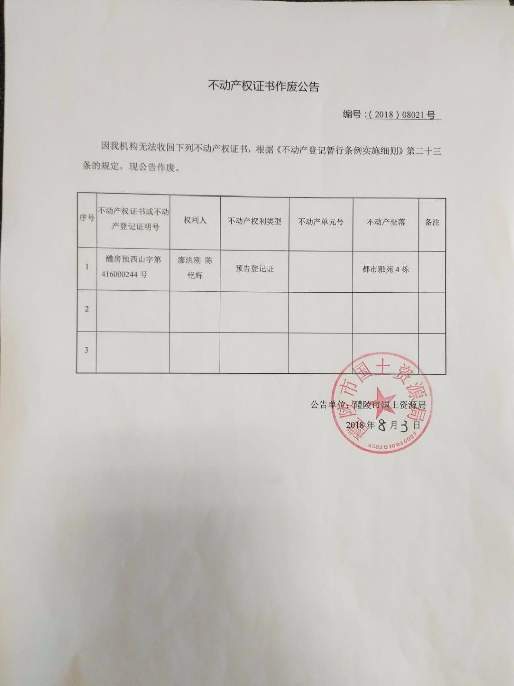 不动产权证书作废公告(廖洪刚、陈艳辉)