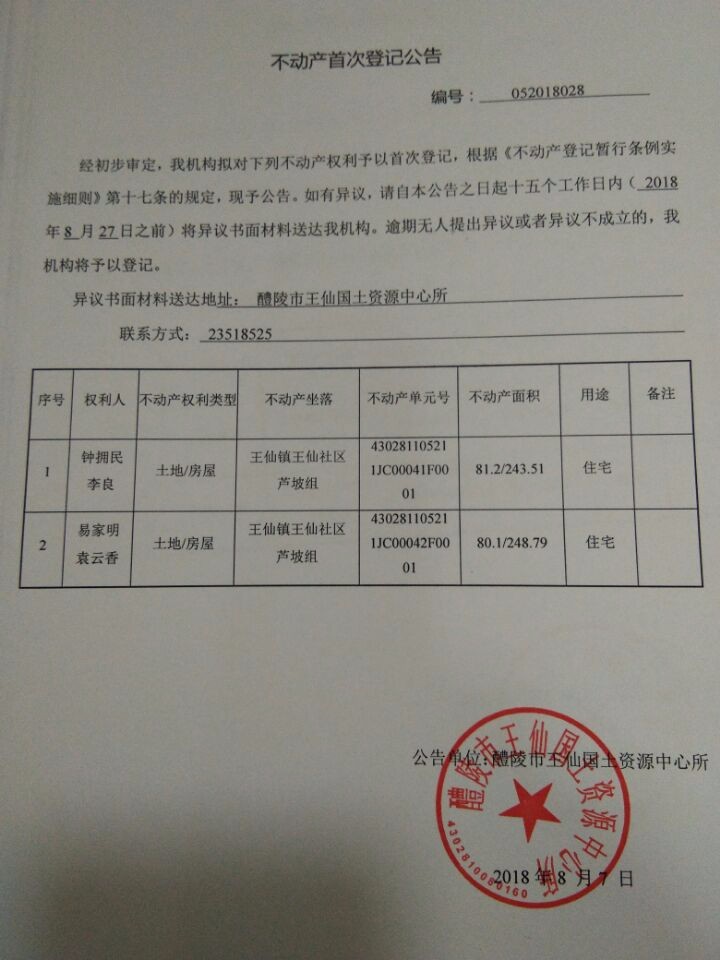 不动产首次登记公告(钟拥民、李良、易家明、袁云香)