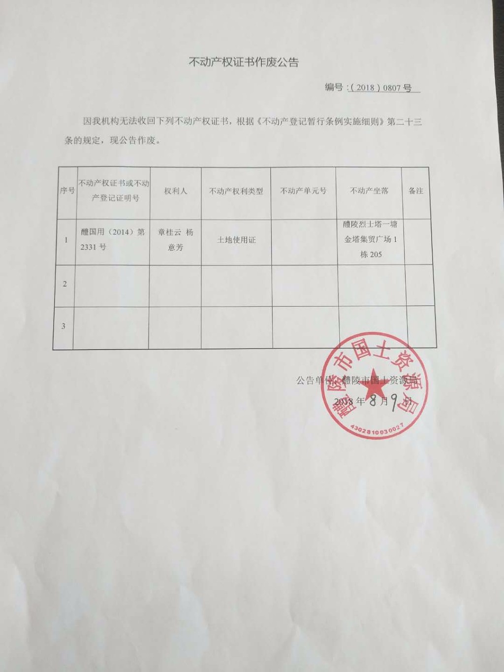 不动产权证书作废公告(章桂云、杨意芳)