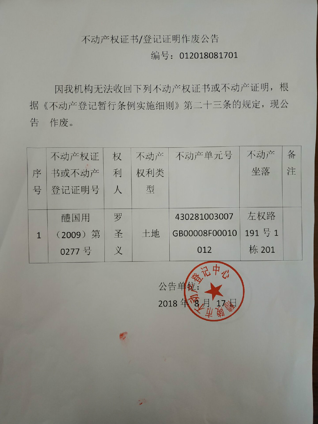 不动产权证书/登记明作废公告(罗圣义)