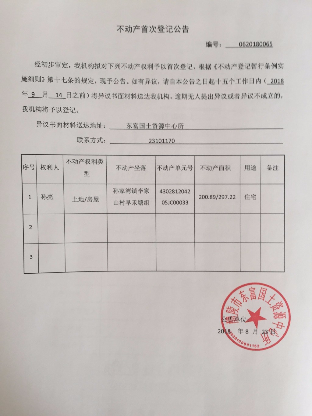 不动产首次登记公告(孙亮)