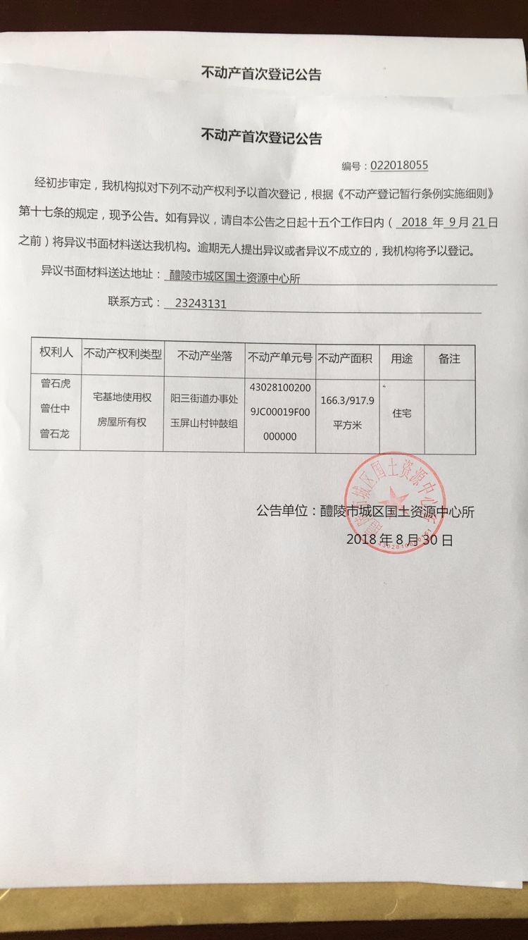不动产首次登记公告(曾石虎、曾仕中、曾石龙)