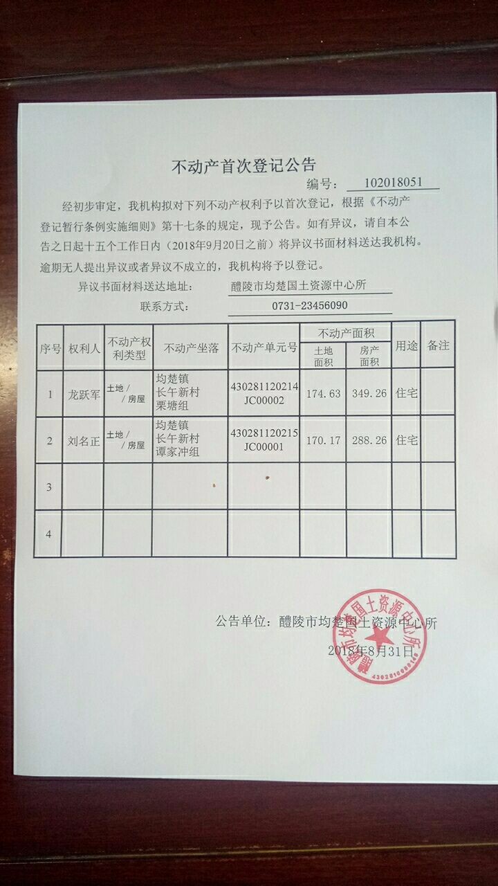 不动产首次登记公告(龙跃军、刘名正)