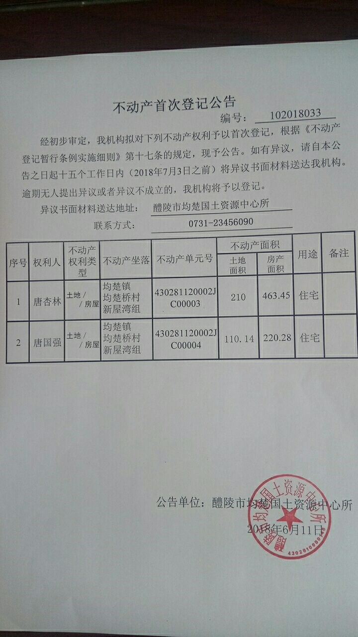 不动产首次登记公告(唐杏林 唐国强)