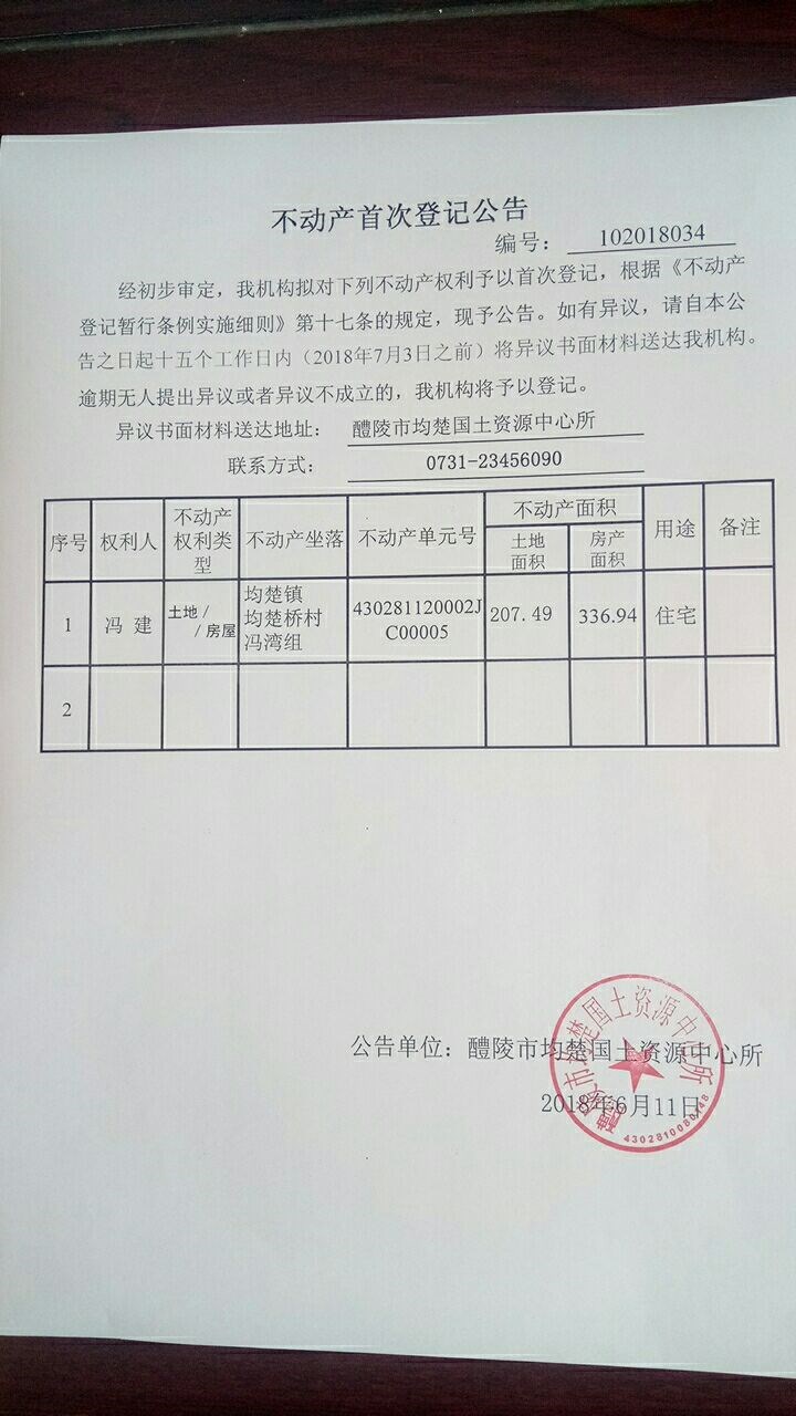 不动产首次登记公告(冯建)