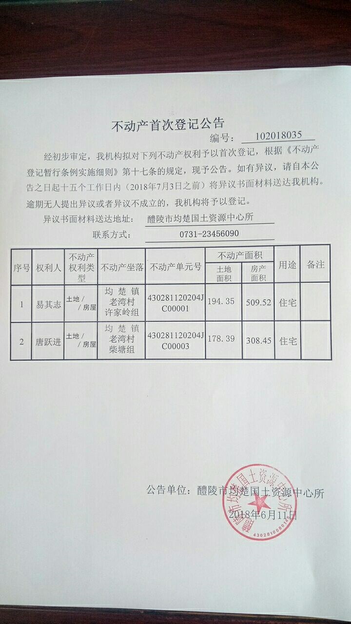 不动产首次登记公告(易其志 唐跃进)