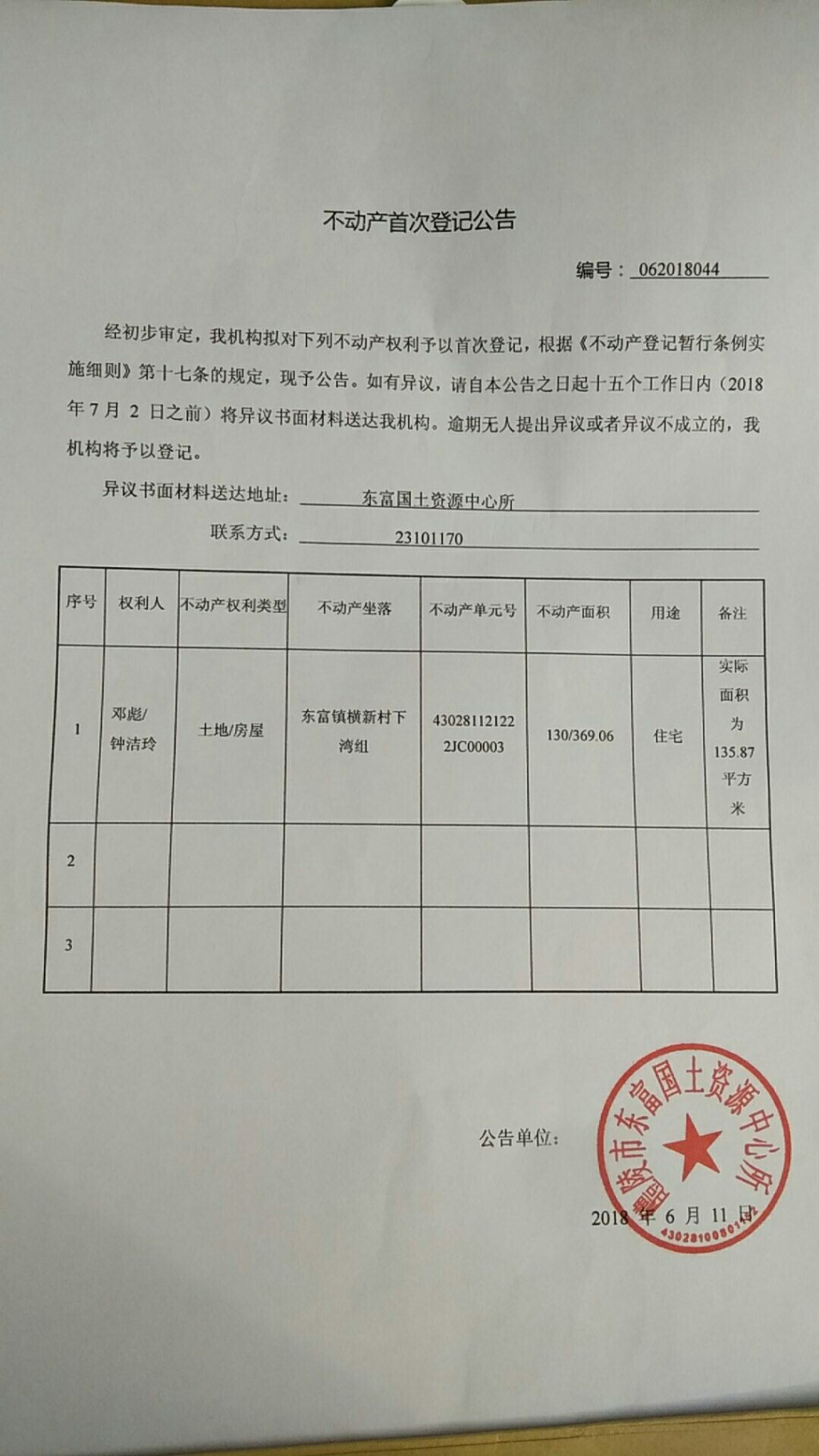 不动产首次登记公告(邓彪 钟洁玲)