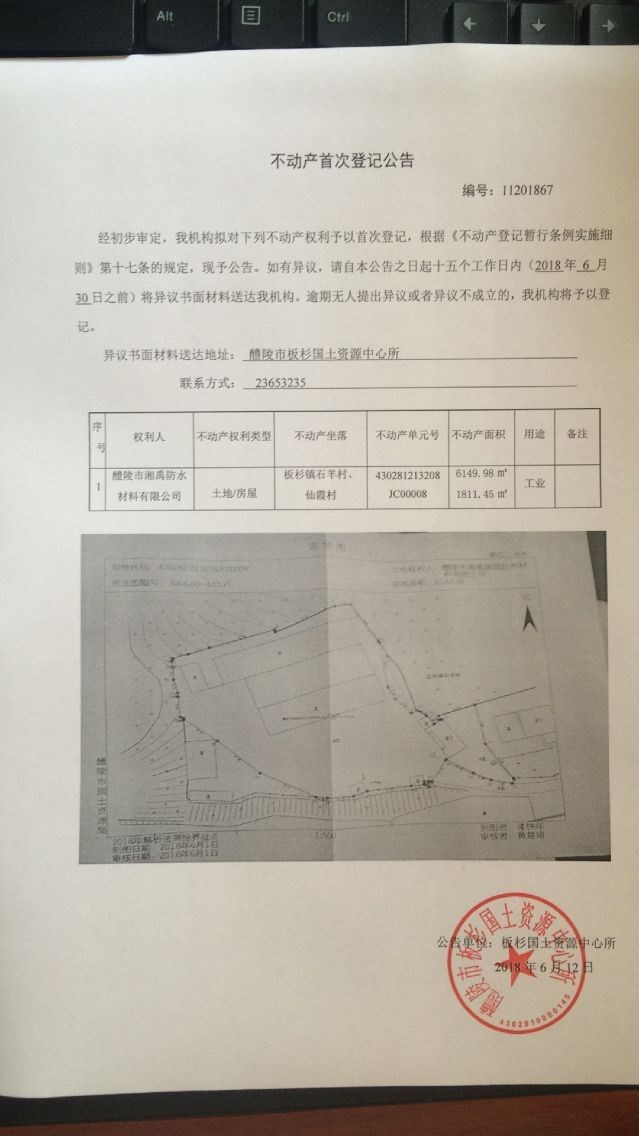 不动产首次登记公告(醴陵市湘禹防水材料有限公司)