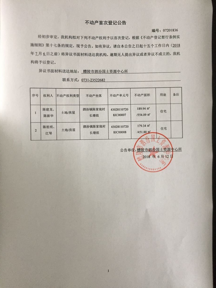 不动产首次登记公告(陈建龙 陈新华、陈祖明 江琴)