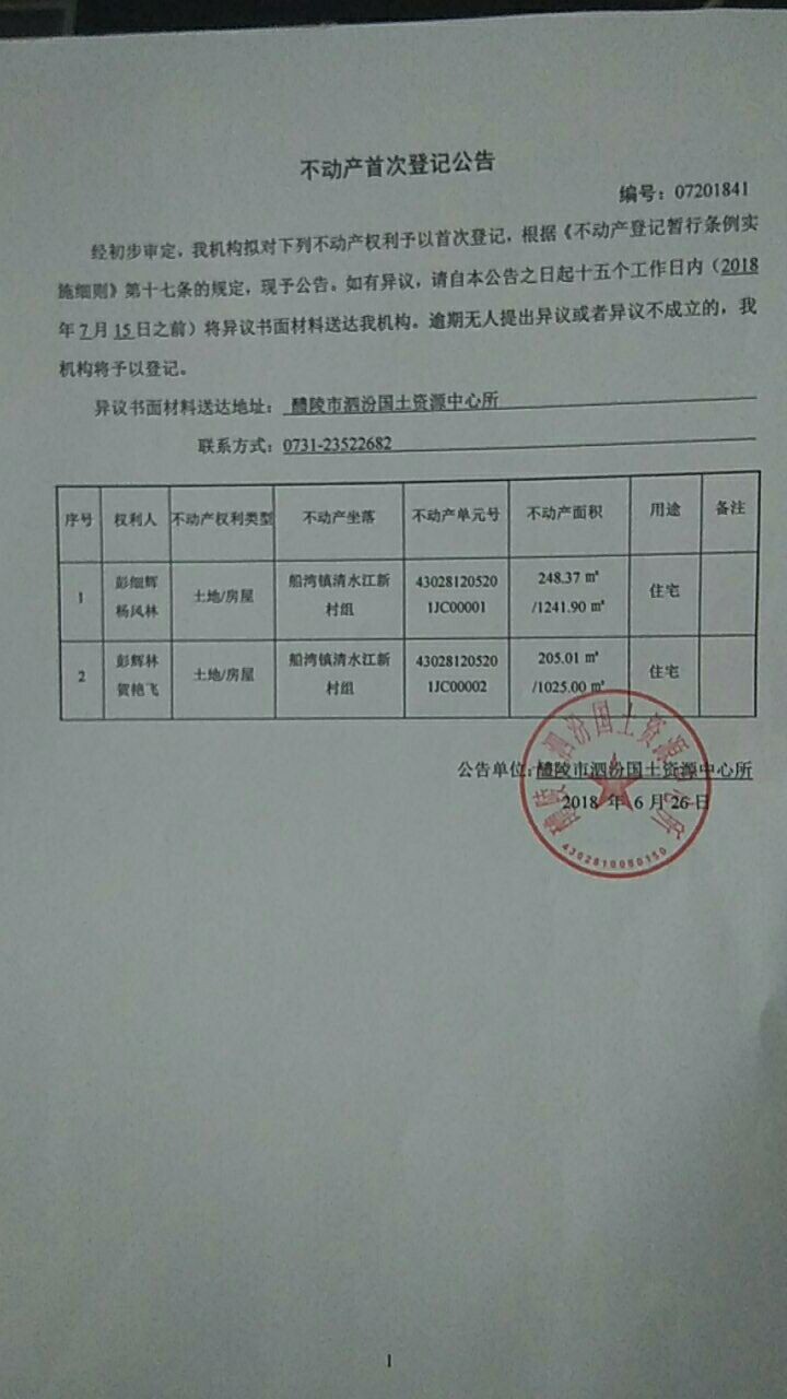 不动产首次登记公告(彭细辉、杨风林、彭辉林、贺艳飞)