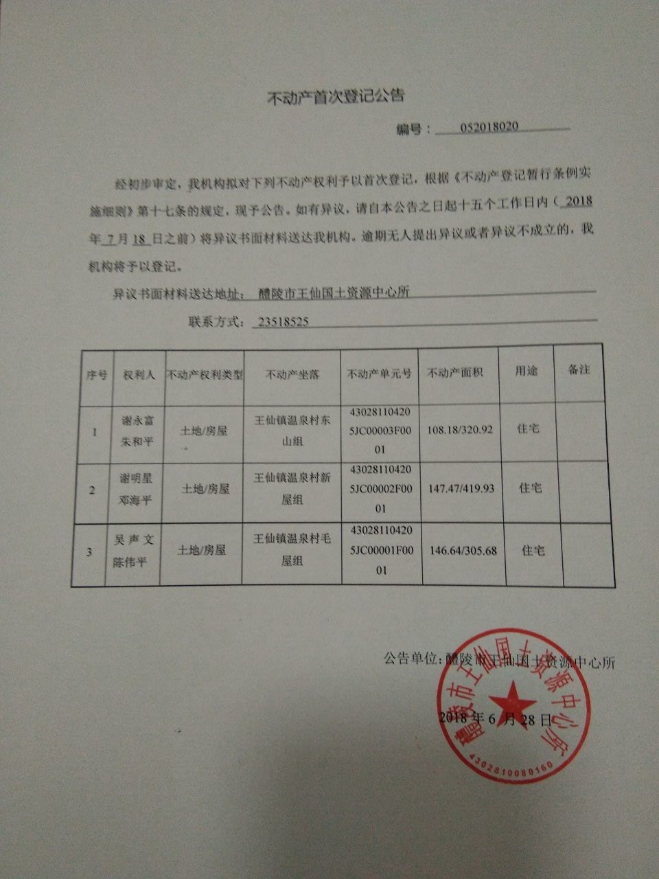 不动产首次登记公告(谢永富 朱和平、谢明星 邓海平、吴声文 陈伟平)
