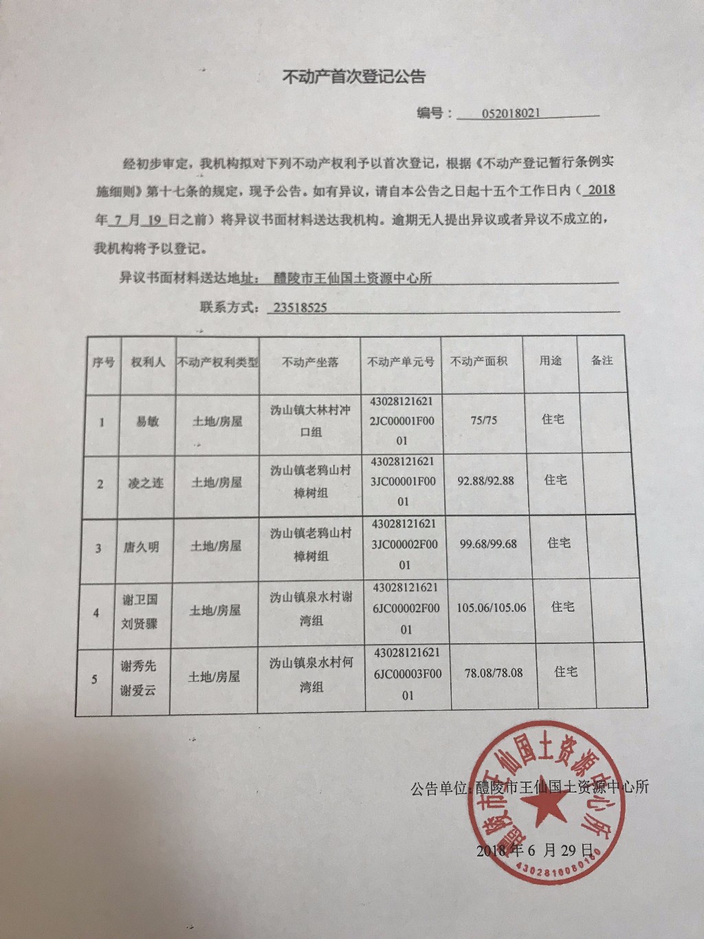 不动产首次登记公告(易敏、凌之连、唐久明、谢卫国、刘贤骤、谢秀先、谢爱云)