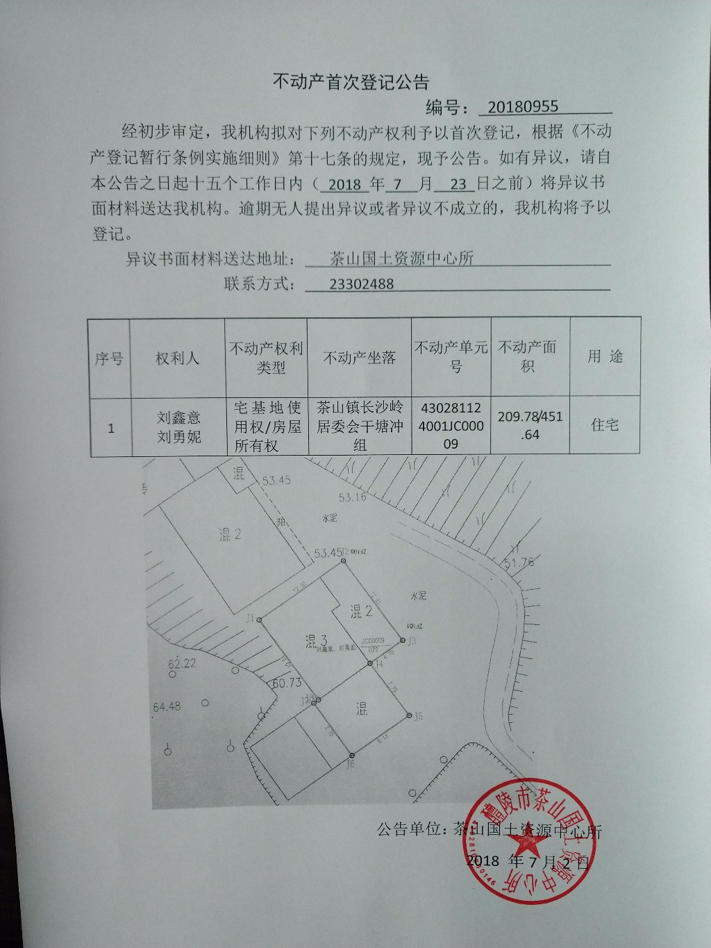 不动产首次登记公告(刘鑫意、刘勇妮)
