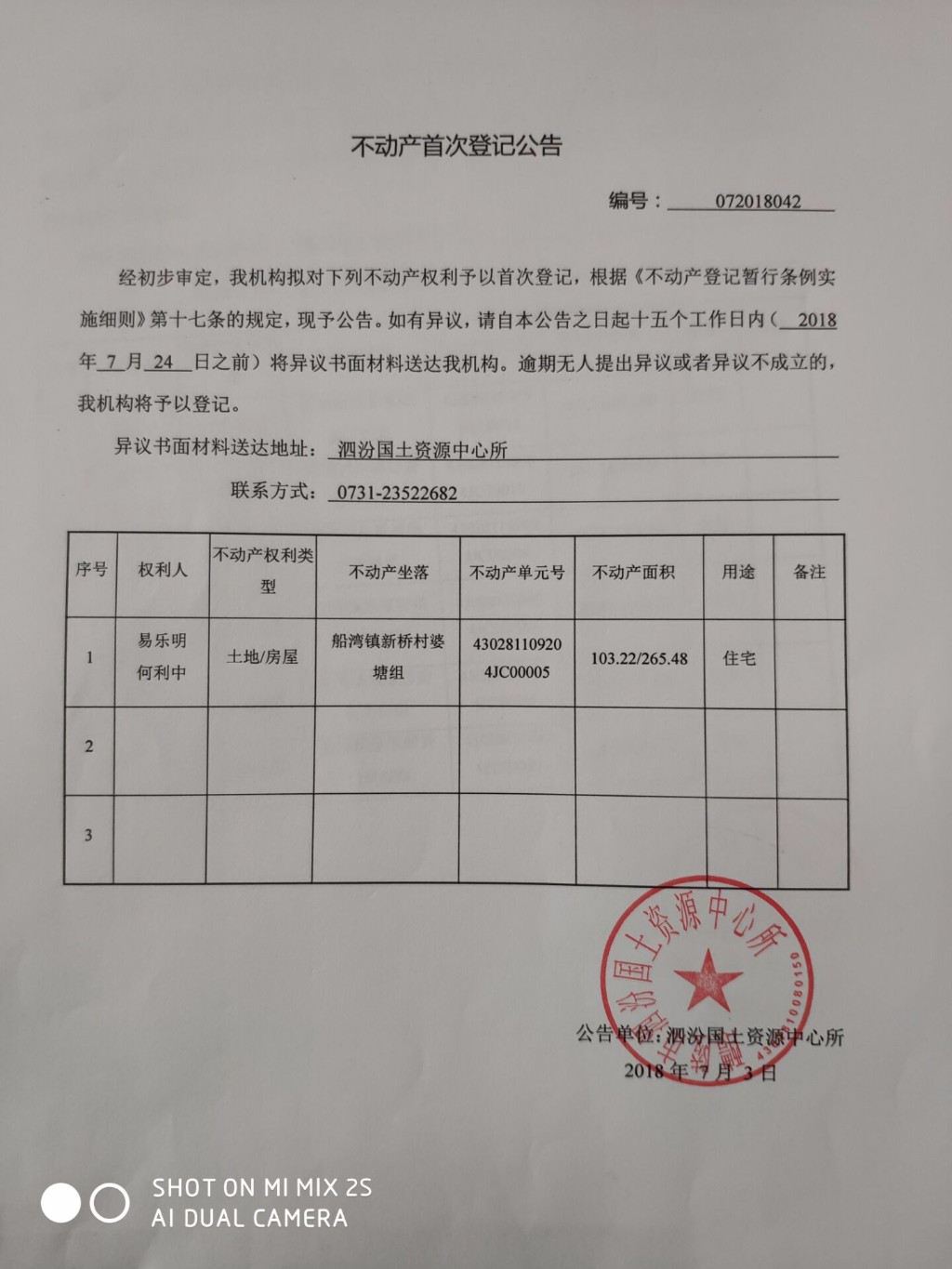 不动产首次登记公告(易乐明、何利中)
