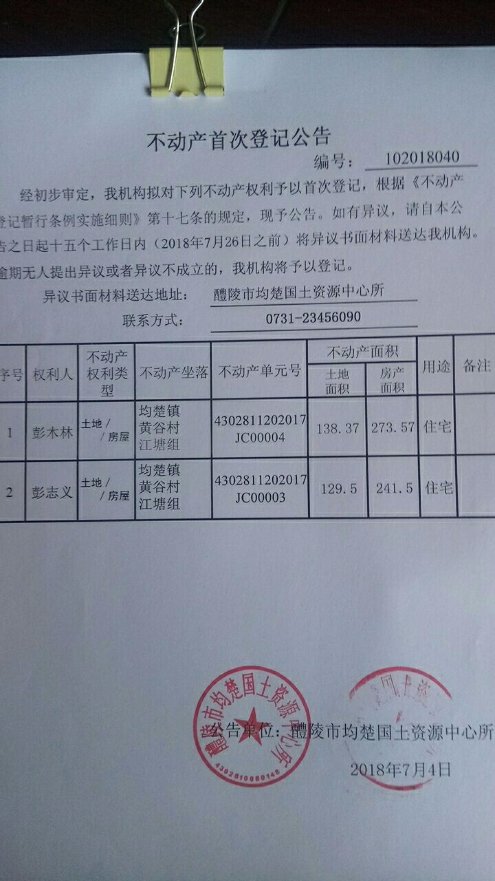 不动产首次登记公告(彭木林、彭志义)