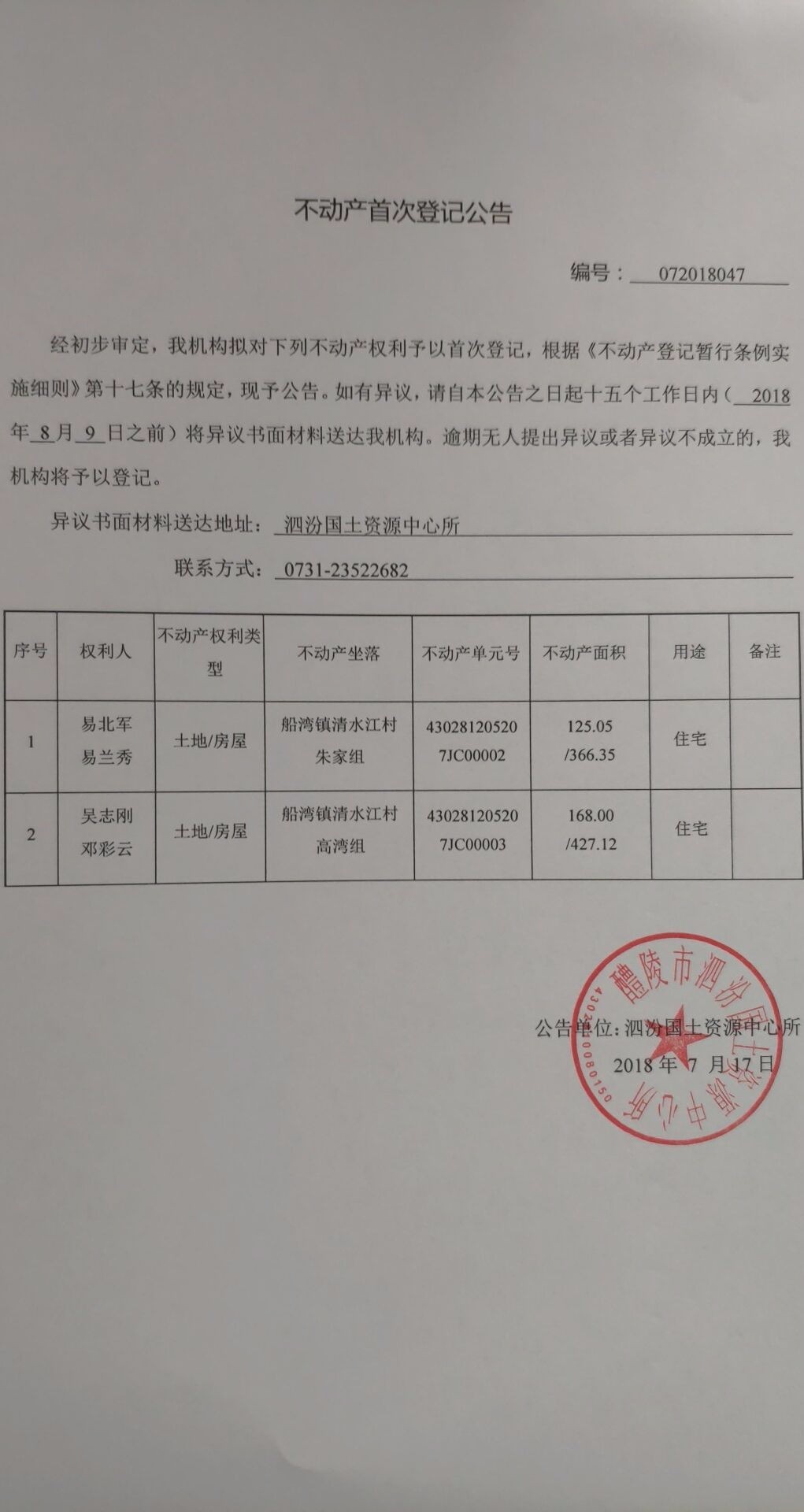 不动产首次登记公告(易北军、易兰秀、吴志刚、邓彩云)