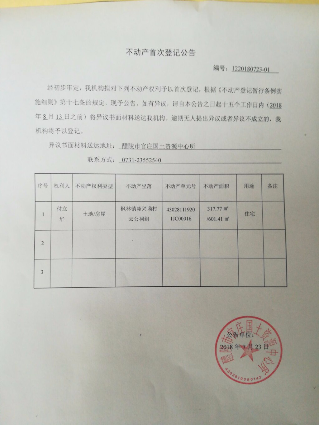 不动产首次登记公告(付立华)