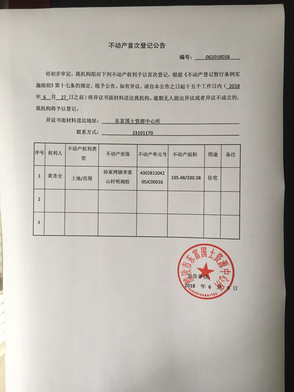 不动产首次登记公告(黄圣全)