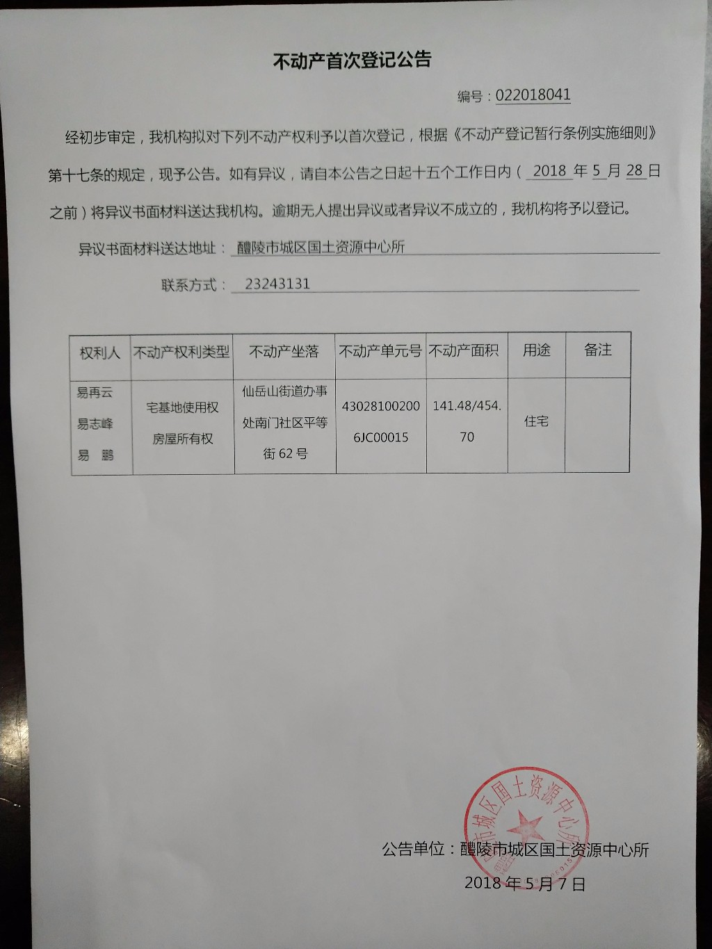 不动产首次登记公告(易再云 易志峰 易鹏)