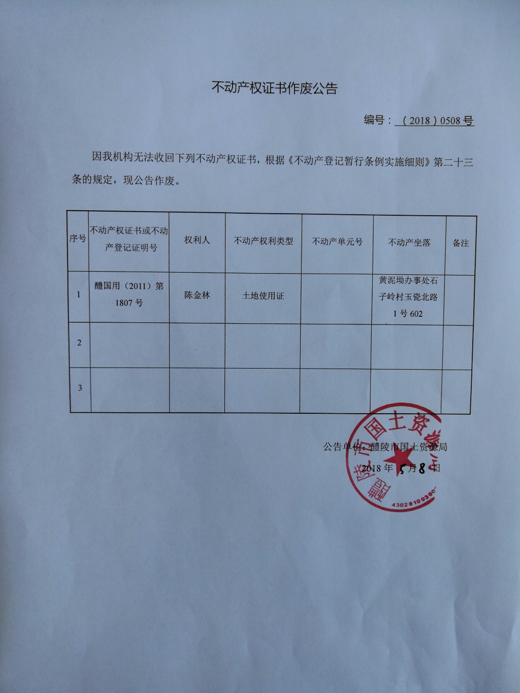 不动产权证书作废公告(陈金林)