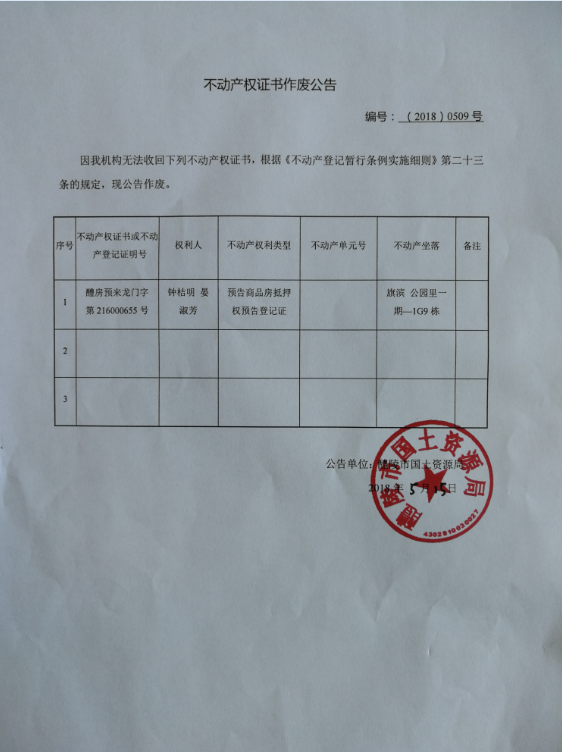 不动产权证书作废公告(钟桔明 晏淑芳)