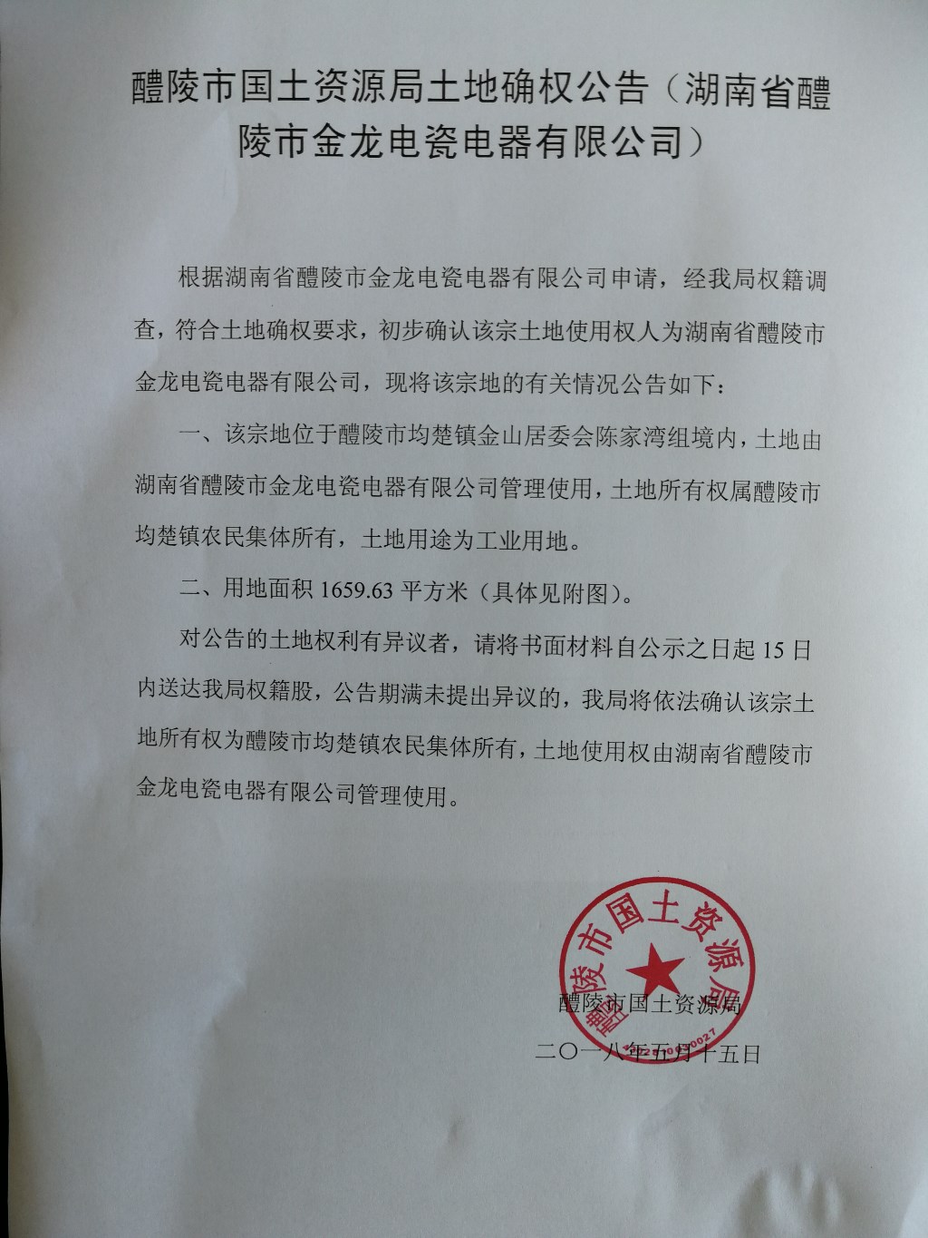 醴陵市国土资源局土地确权公告(湖南省醴陵市金龙电瓷电器有限公司)