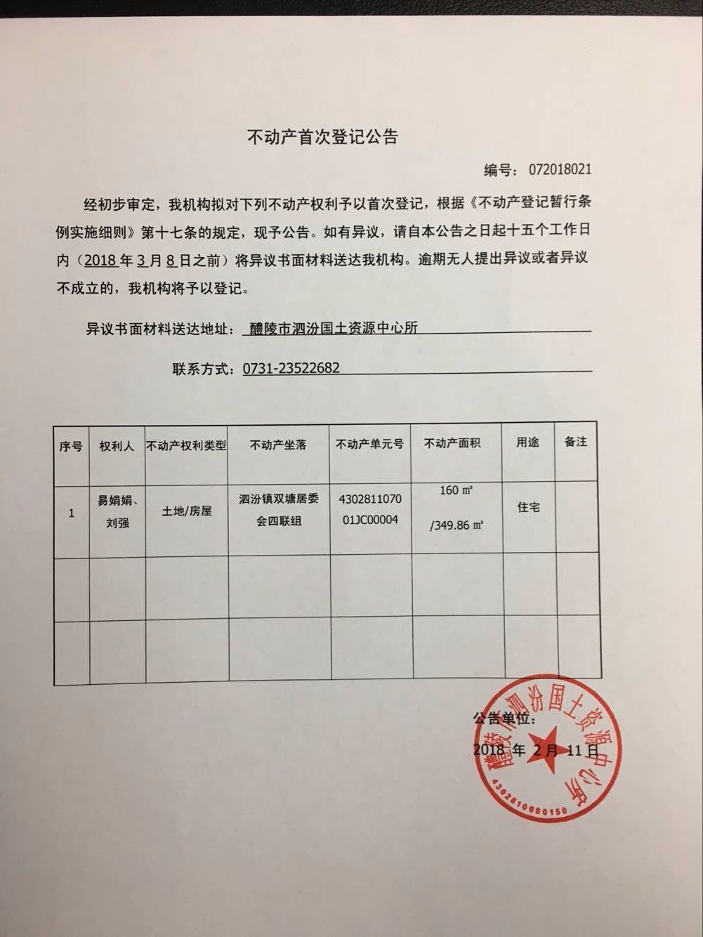 不动产首次登记公告(易娟娟 刘强)