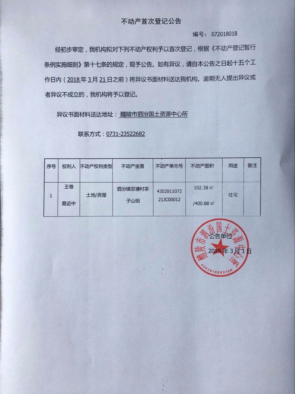不动产首次登记公告(王卷 易近中)
