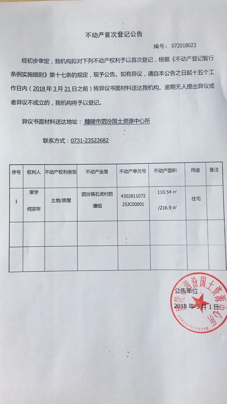 不动产首次登记公告(荣学 何宗年)