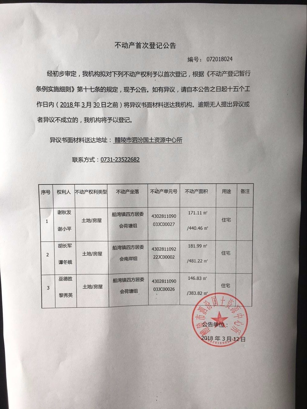 不动产首次登记公告(谢秋发 谢小平、胡长军 谭冬娥、巫德胜 黎秀英)