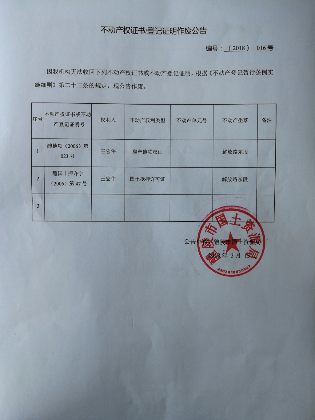 不动产权证书/登记明作废公告(王宏伟)