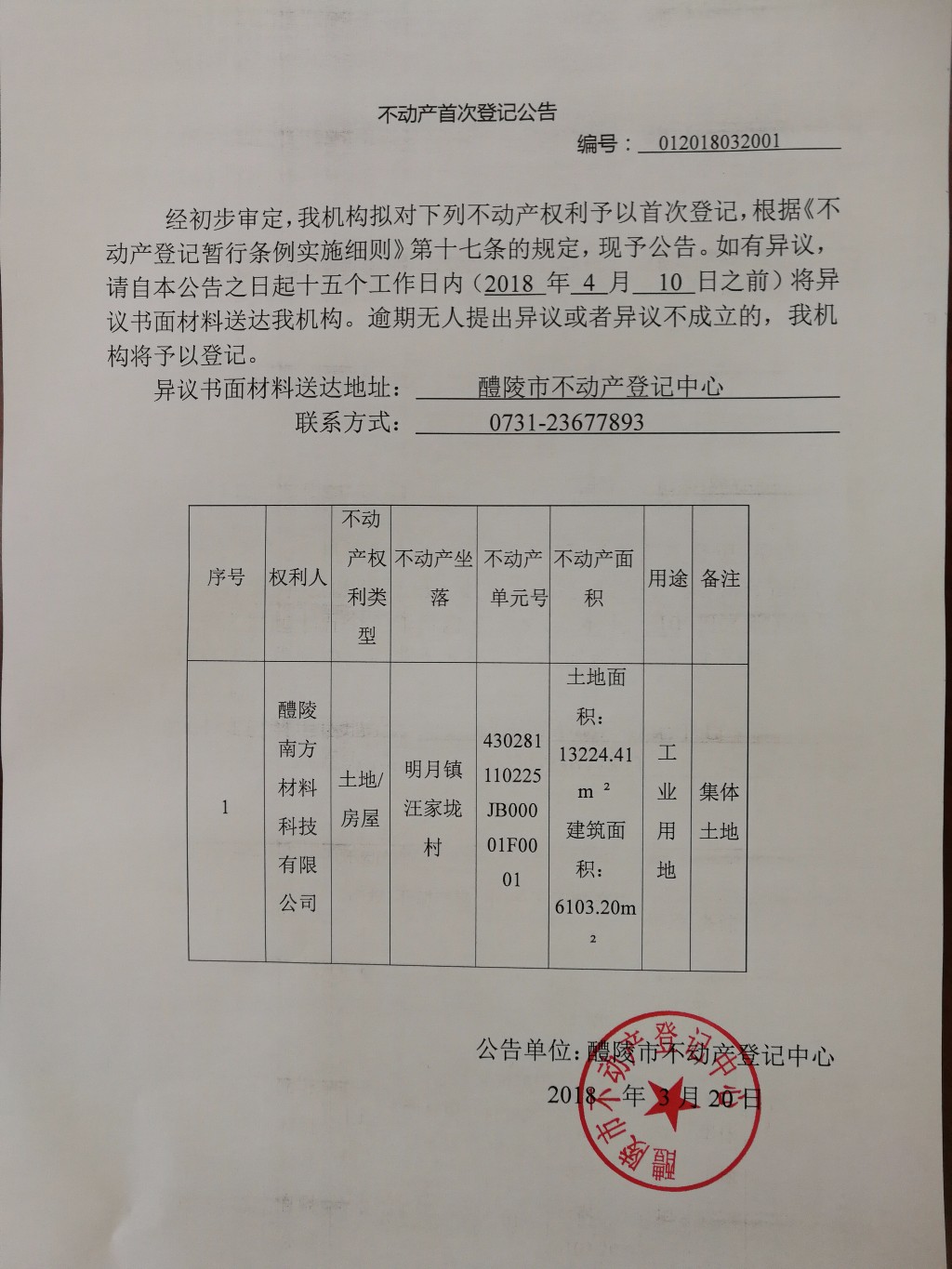 不动产首次登记公告(醴陵南方材料科技有限公司)